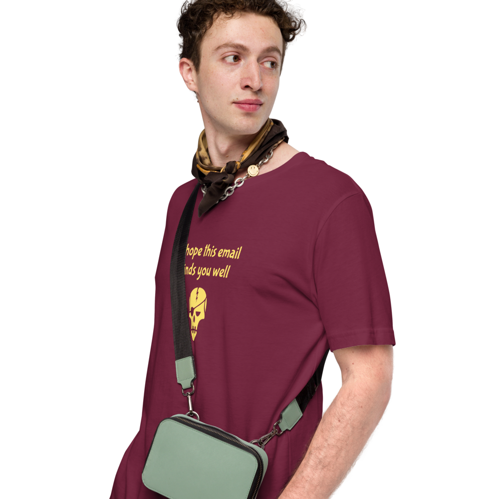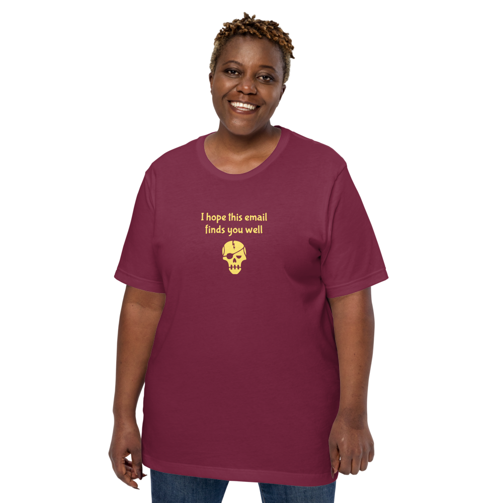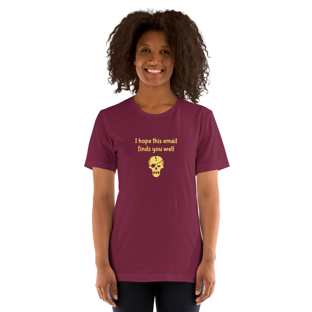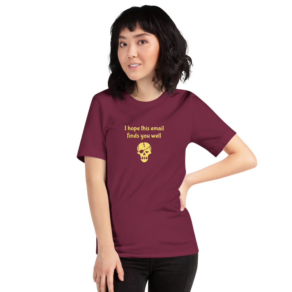 This t-shirt says "I hope this email finds you well", then has some sort of a pirate skull. The juxtaposition is the joke.