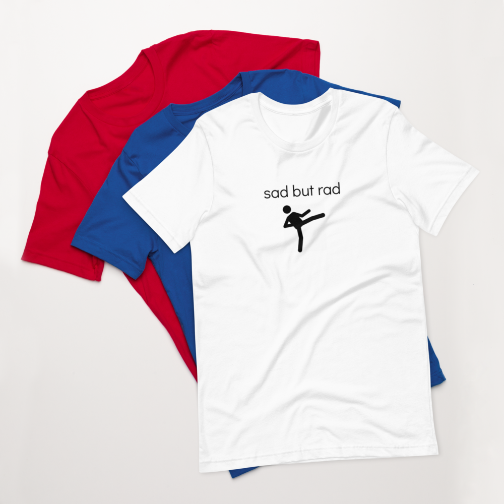 A man kicks wildly in the air, clearly he is trained in karate. His shirt reads "sad but rad". You don't mess with him.