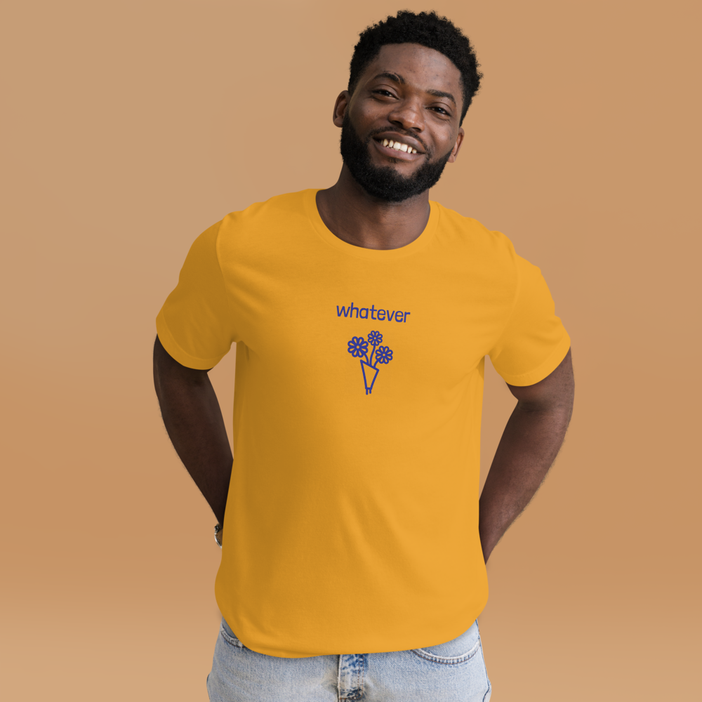 This t-shirt has flowers on it, and the word whatever. Not sure why that is. Whatever.