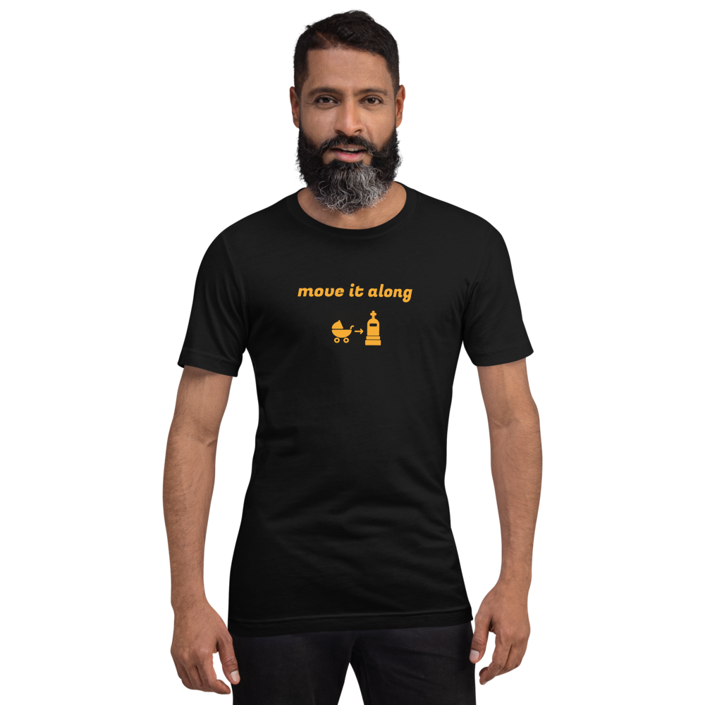 Baby to the grave, as the old saying goes. Move it along in this death related t-shirt.
