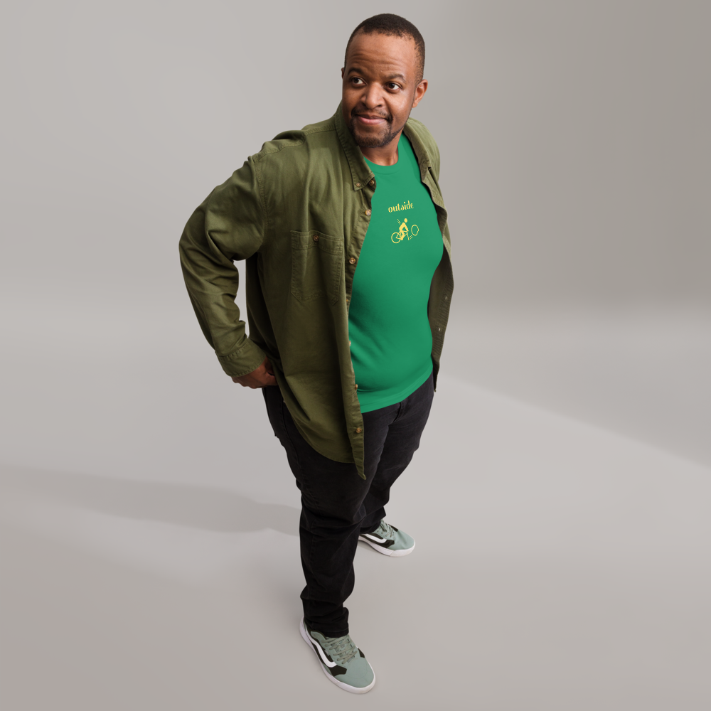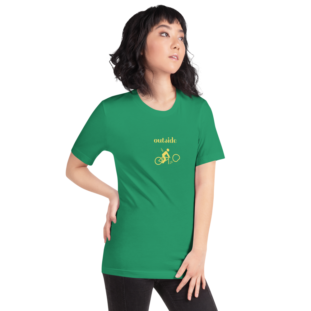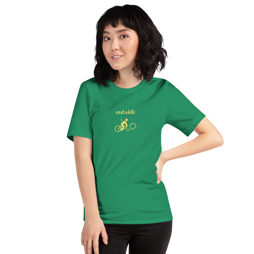 Outside is scary and dangerous, especially for bikers on bicycles. What if the wheel falls off? I dunno, better get back inside. And wear this t-shirt.